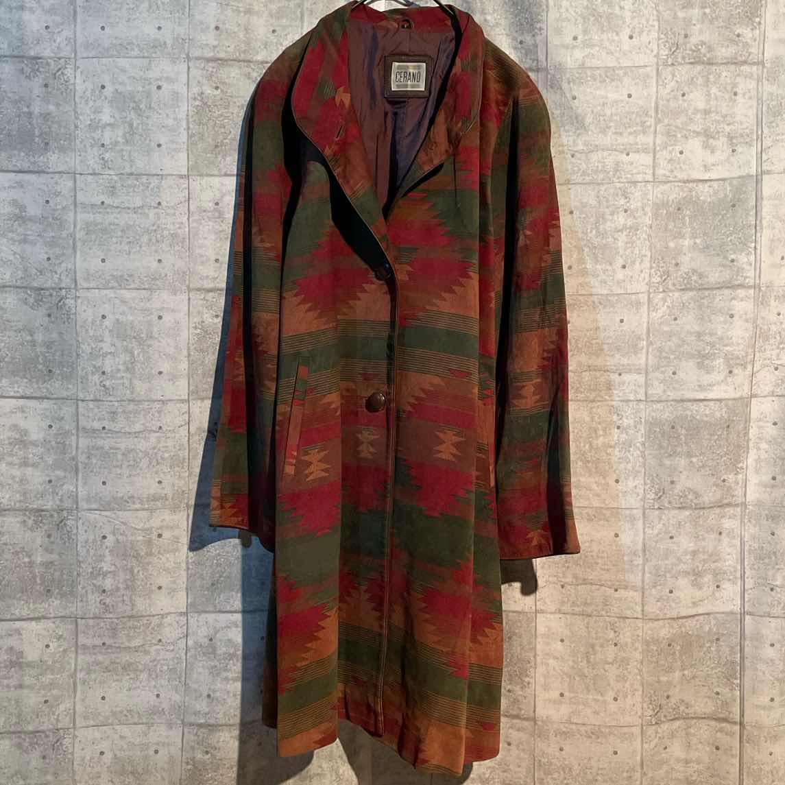 独特の色使いとパターンが目を引くネイティブ柄のロングコート。 深みのあるグリーンやレッドのトーンが秋冬スタイルにぴったり。 個性的ながらも上品さを感じるデザインで、羽織るだけで主役になるアイテム。 ユニセックスで着用できるヴィンテージ好き必見の一着。 ハッシュタグ #vintage #nativepattern #ethniccoat #ロングコート #古着コーデ #個性派ファッション #ユニセックス