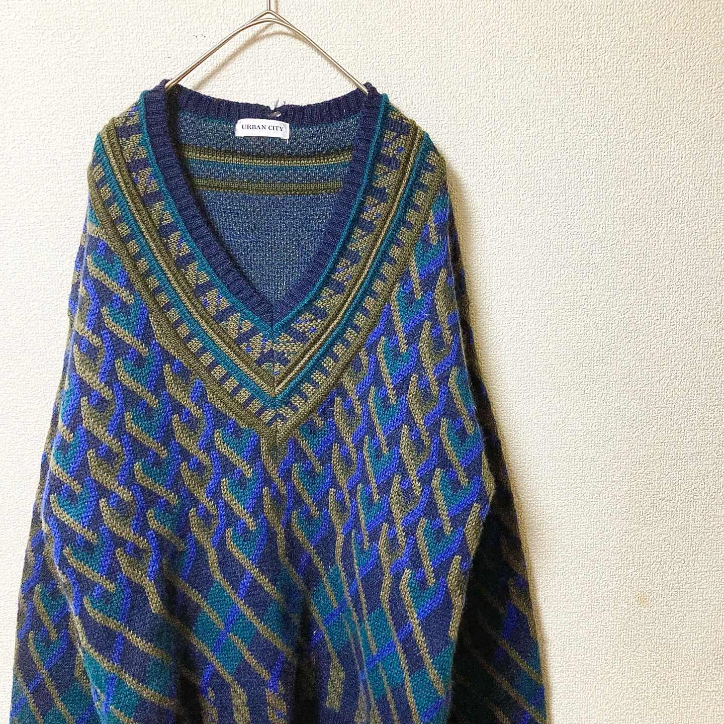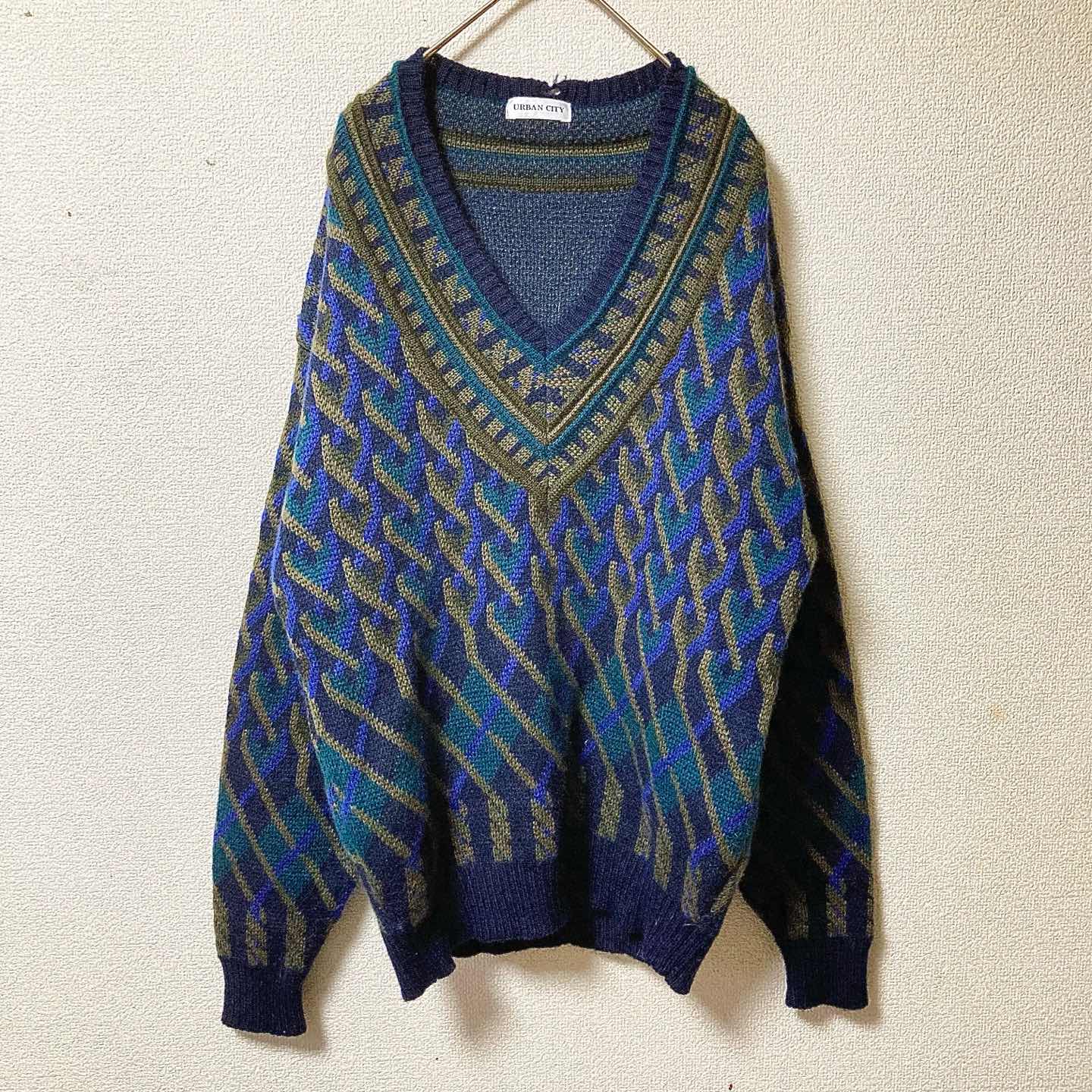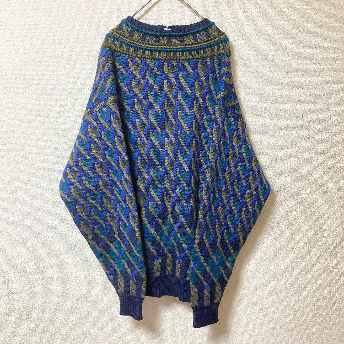 90s Geometric Wool V-Neck Knit Sweater Navy L