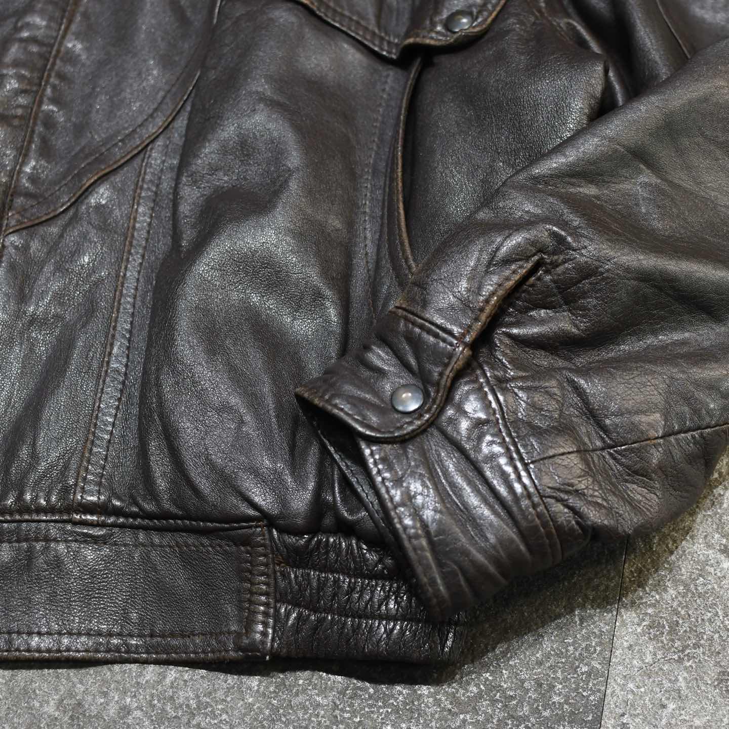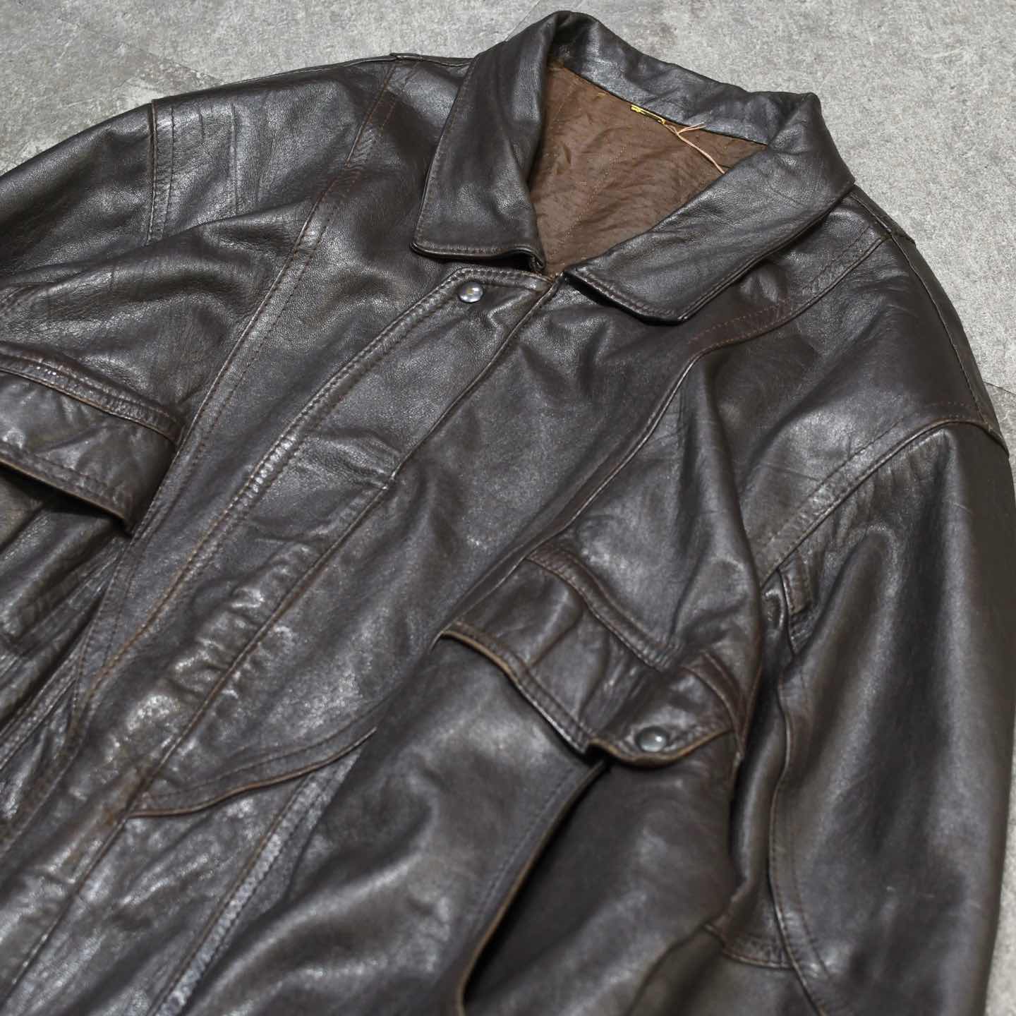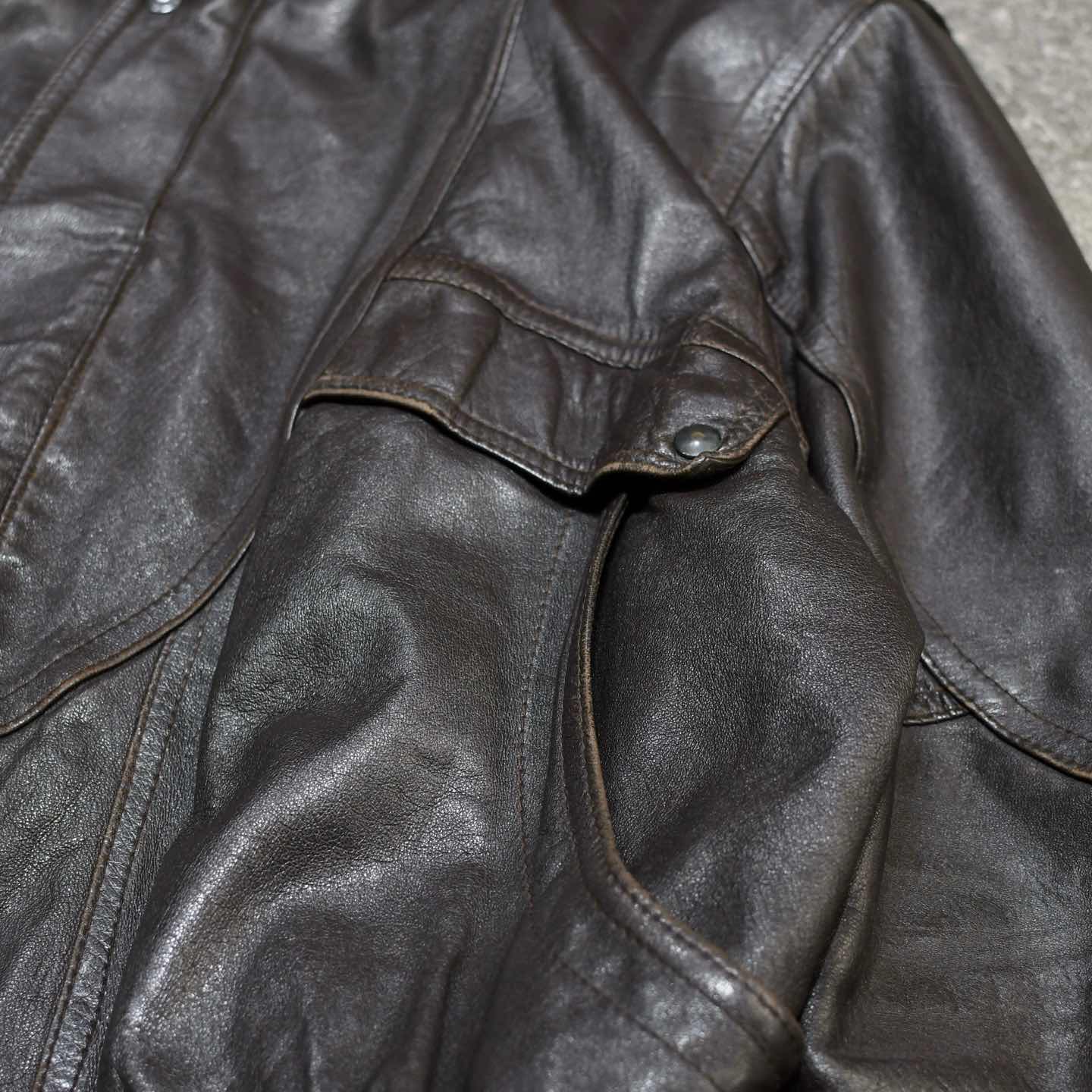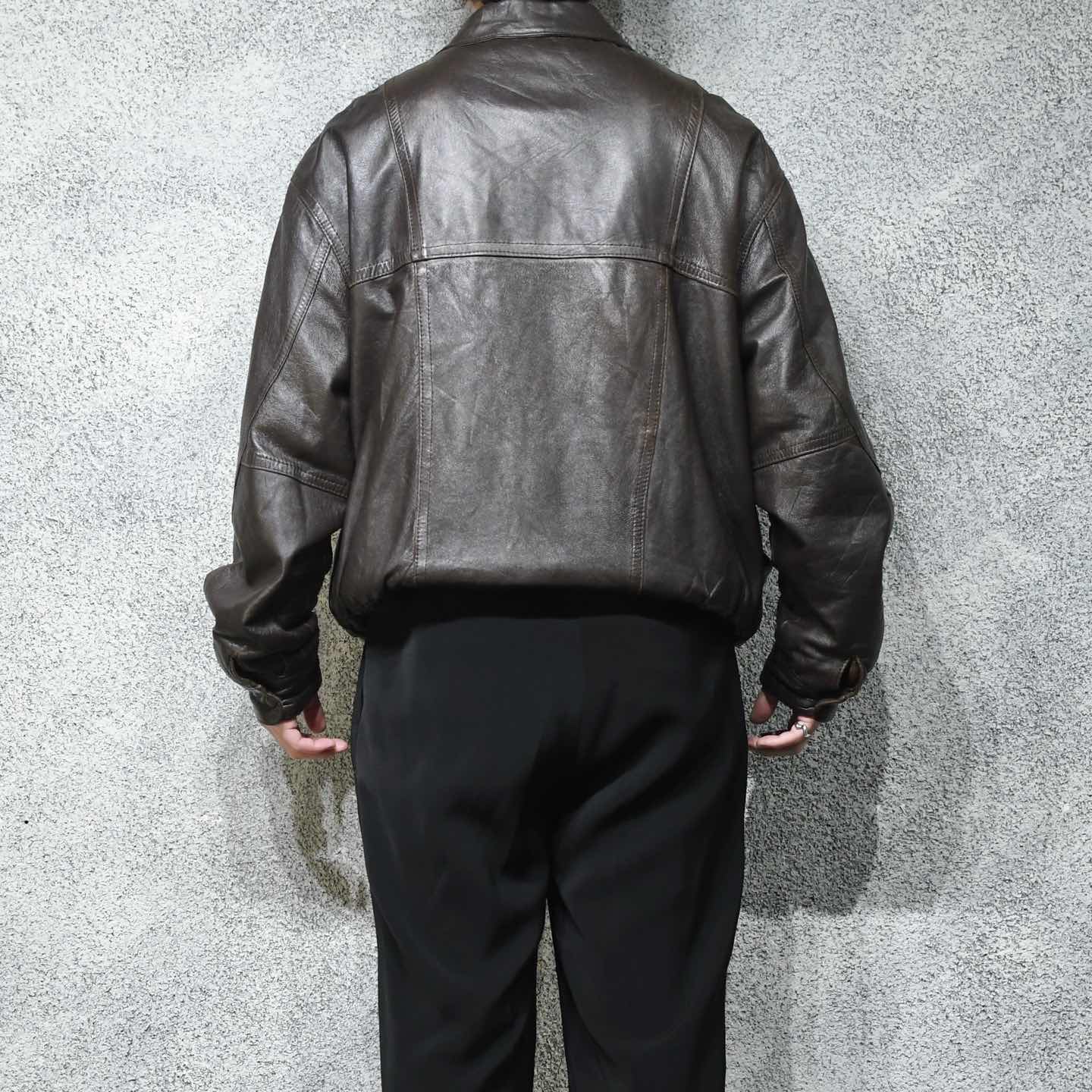SIZE:56 着丈75cm 肩幅59cm 身幅73cm 袖丈65cm fabric/leather 着用画像 177cm/64kg レザージャケットから、尖った印象を 良い塩梅で削ぎ落とした、丸みのあるシルエット。 しなやかさのあるレザーで、肌馴染みが良く 腰元で溜まるシルエットは、レザーアイテムの中でも 落とし込みやすく、身に纏いやすい1着では ないでしょうか。 結局のところ、他の素材と比べ重量が出てしまう レザーのアイテムにとって、手元においても 疎遠にならずに活躍してくれる個体です。 黒を選びがちなレザーで、 差別化出来る上品なダークブラウン、 そしてやり過ぎないポケットのデザイン。 雑にも綺麗にも、そしてカジュアルにもどうぞ。 ※左アームにペンキ飛びあり。 ※裏地に痛み、汚れあり。 ※内ポケット内、破れにて使用不可。 ※撮影状況により、実物と多少色が異なる場合が ございます。 ※古着を取り扱っているため、気づかない汚れや ほつれ等がある場合がございます。 予めご了承ください。 ※サイズは着用感で選んでおり、 表記サイズではございません。 表記サイズは説明欄の最初に記載しております。 古着 オーバーサイズ old vintage ヴィンテージ used 80's 90's アメリカ古着 ユーロ古着 POLO RALPH LAUREN Eddie Bauer OLD GAP LANDS' END ランズエンド LLBean エルエルビーン オールドギャップ エディーバウアー ラルフローレン ブルックスブラザーズ Brooks Brothers などがお好きな方 #vintage #オーバーサイズ #old #used #90s #80s #古着 #ヴィンテージ #アメリカ古着 #ユーロ古着 #LLBean #エルエルビーン #EddieBauer #エディーバウアー #oldgap #オールドギャップ #LANDSEND #ランズエンド #NAUTICA #ノーティカ #ラルフローレン #POLORALPHLAUREN #ブルックスブラザーズ #BrooksBrothers #レザージャケット #レザーブルゾン #ジャケット #ブルゾン