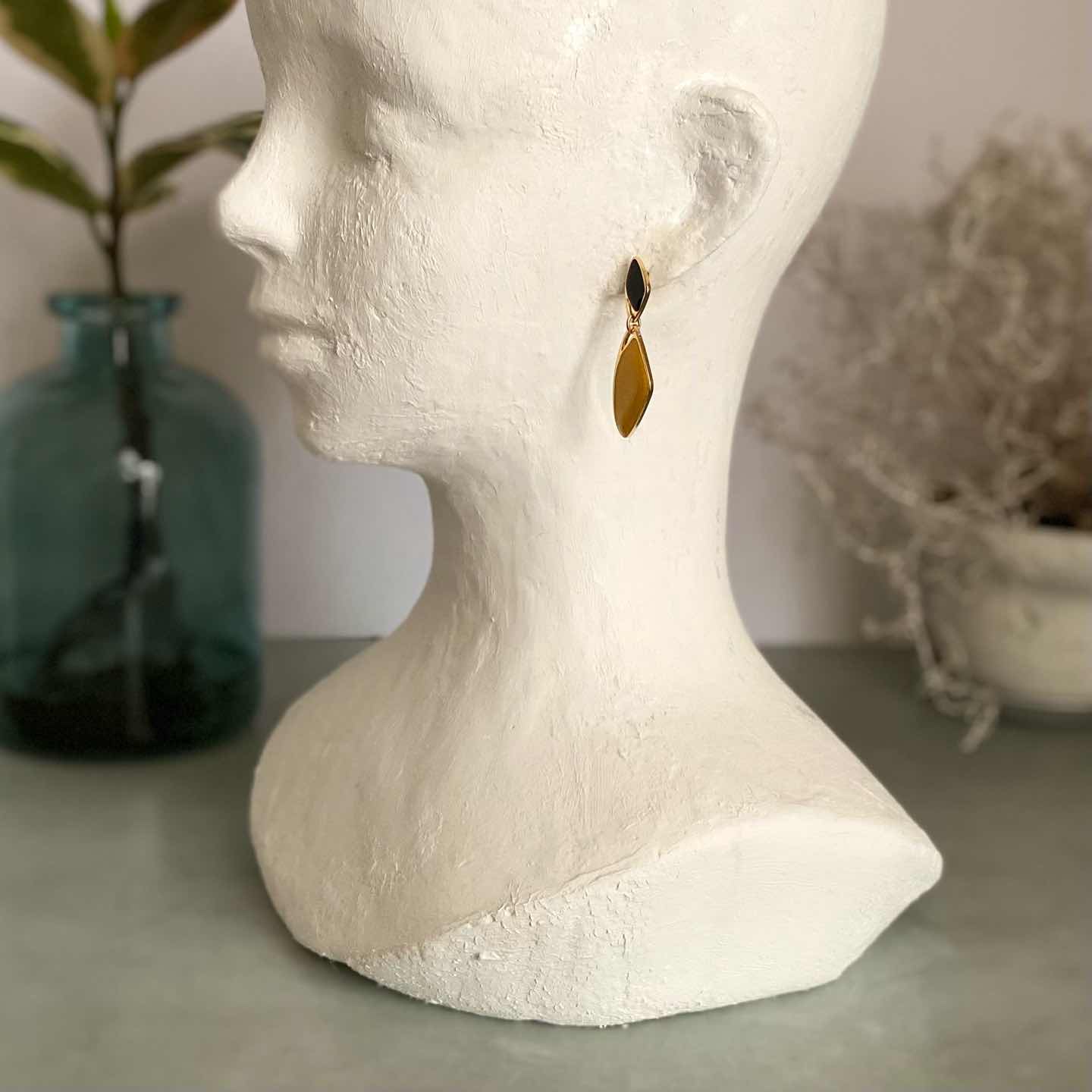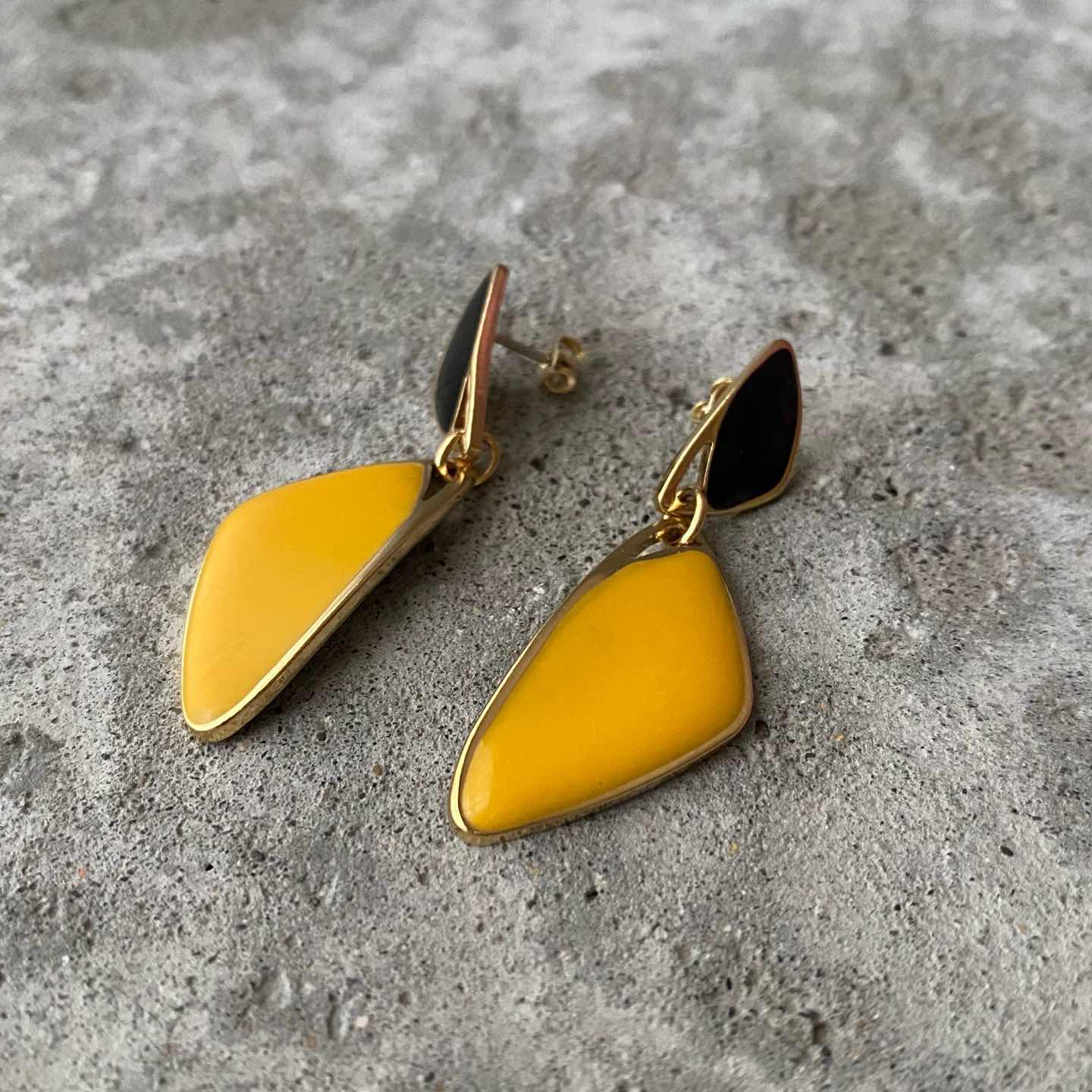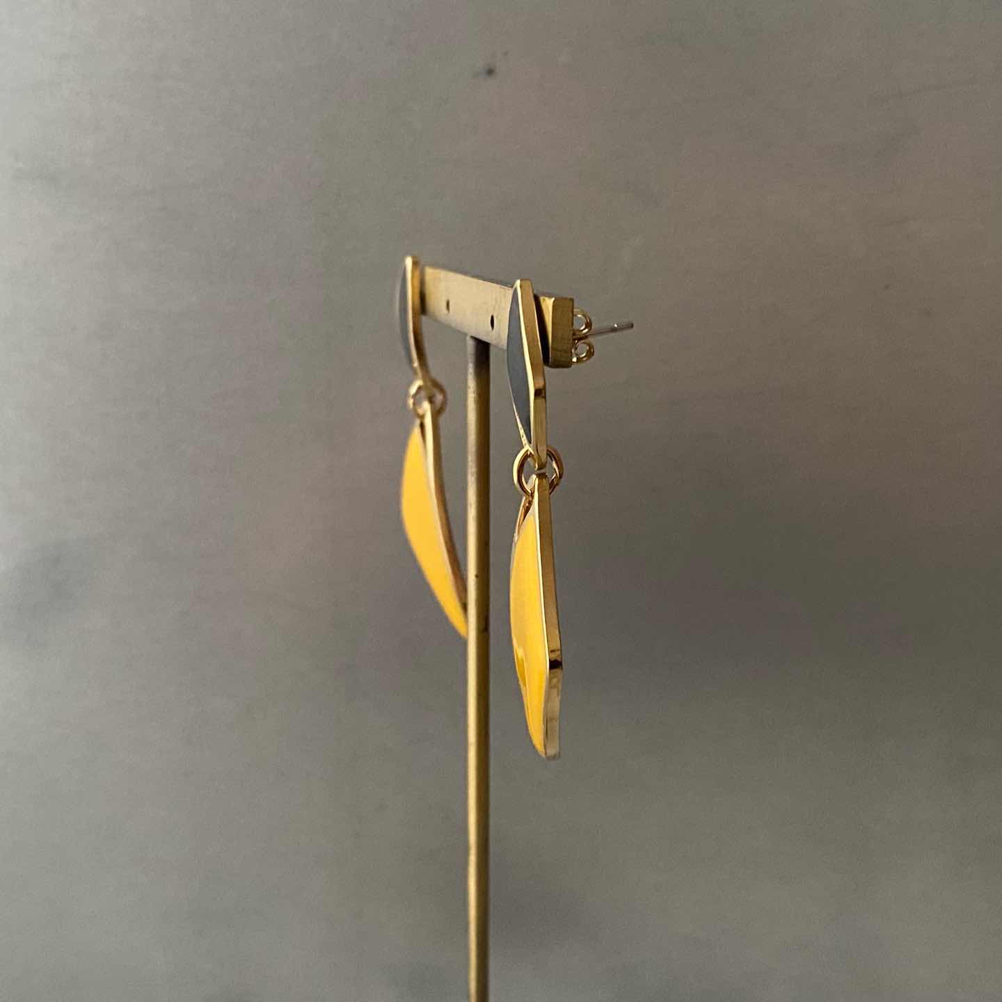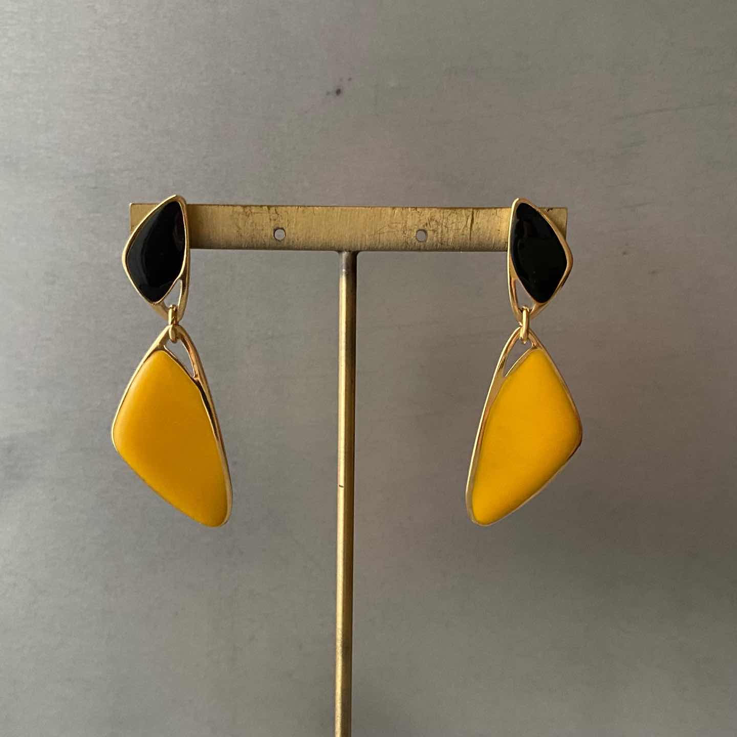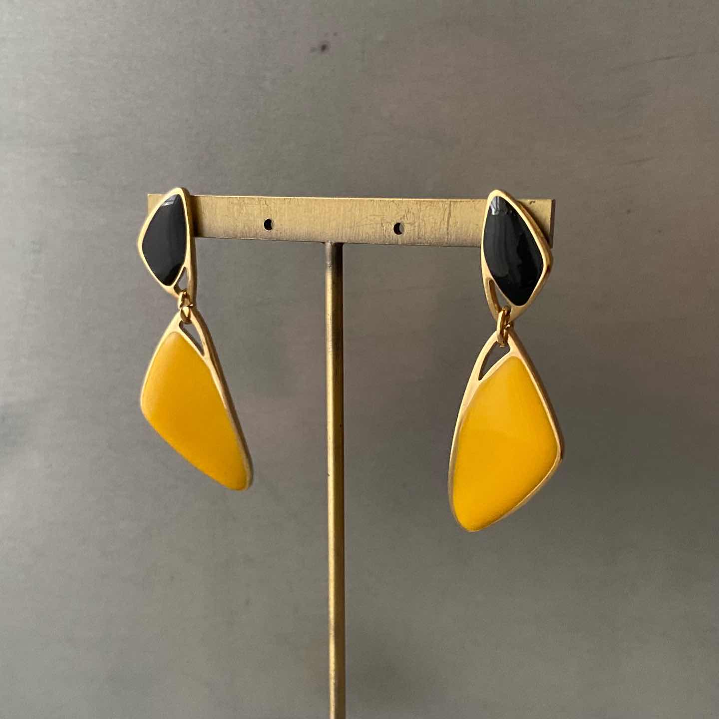 黄色×黒のレトロなエナメルがお洒落なUSAヴィンテージピアス。ほどよく存在感がありスタイリングの差し色におすすめです。 □Materials メタル(ゴールドメッキ) □Size 約H4.7×W1.6㎝ 10g □Condition【C】 エナメルやメタル部分に多少のスレや色ムラがみられます。中古品であることをご理解のうえお買い求めください。ご購入前に必ずショッピングガイドのご確認をお願いいたします。 【S】未使用 【A】未使用に近い 【B】やや使用感あり 【C】使用感あり Item No.3468