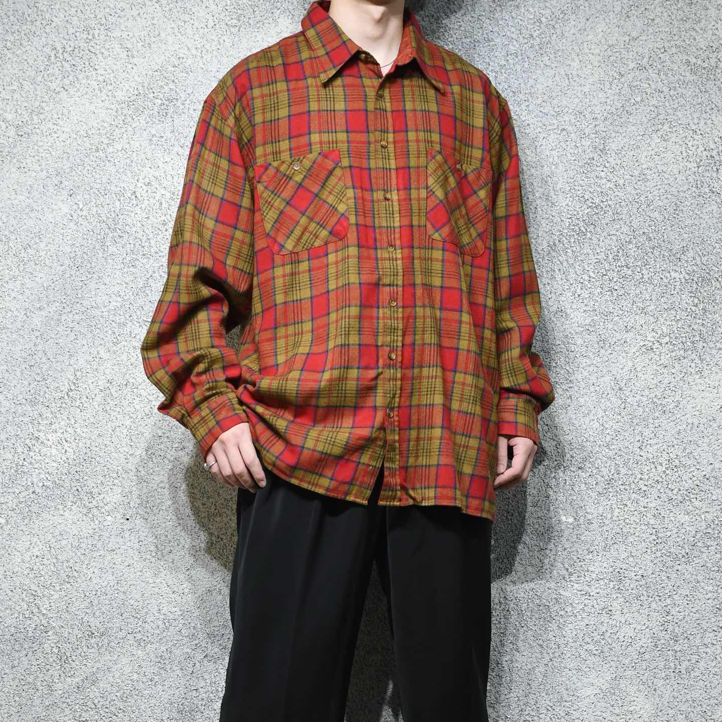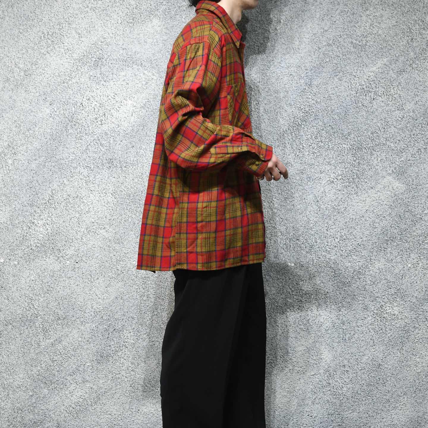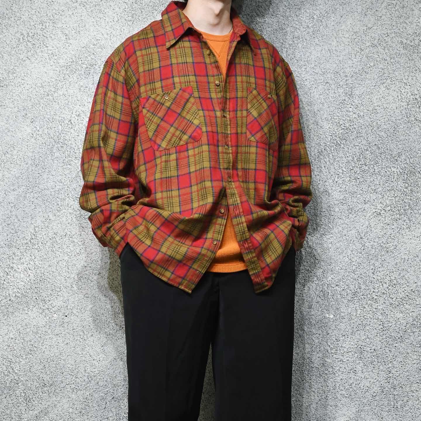 SIZE:XLG-TL 着丈84cm 肩幅58cm 身幅73cm 袖丈67cm fabric/acrylic 着用画像 177cm/64kg ライトアウターの代わりにシャツを ジャケットとしてもどうでしょう。 そんな使い道も浮かぶ、ゆったりしたサイズ感の チェックシャツです。 ふわっとしたアクリル生地、季節を感じる色合い。 サーマルやパーカー、スウェット、 さらにはニットの上から。 いつもと着るアイテムの順番を逆にした スタイリング、そんなのもおすすめです。 ※撮影状況により、実物と多少色が異なる場合が ございます。 ※古着を取り扱っているため、気づかない汚れや ほつれ等がある場合がございます。 予めご了承ください。 ※サイズは着用感で選んでおり、 表記サイズではございません。 表記サイズは説明欄の最初に記載しております。 古着 オーバーサイズ old vintage ヴィンテージ used 80's 90's アメリカ古着 ユーロ古着 POLO RALPH LAUREN Eddie Bauer OLD GAP LANDS' END ランズエンド LLBean エルエルビーン オールドギャップ エディーバウアー ラルフローレン ブルックスブラザーズ Brooks Brothers 赤 レッド オレンジ 長袖シャツ シャツ ネルシャツ フランネルシャツ などがお好きな方 #vintage #オーバーサイズ #old #used #90s #80s #古着 #ヴィンテージ #アメリカ古着 #ユーロ古着 #LLBean #エルエルビーン #EddieBauer #エディーバウアー #oldgap #オールドギャップ #LANDSEND #ランズエンド #NAUTICA #ノーティカ #ラルフローレン #POLORALPHLAUREN #ブルックスブラザーズ #BrooksBrothers #ネルシャツ #フランネルシャツ #チェックシャツ #シャツ #長袖シャツ