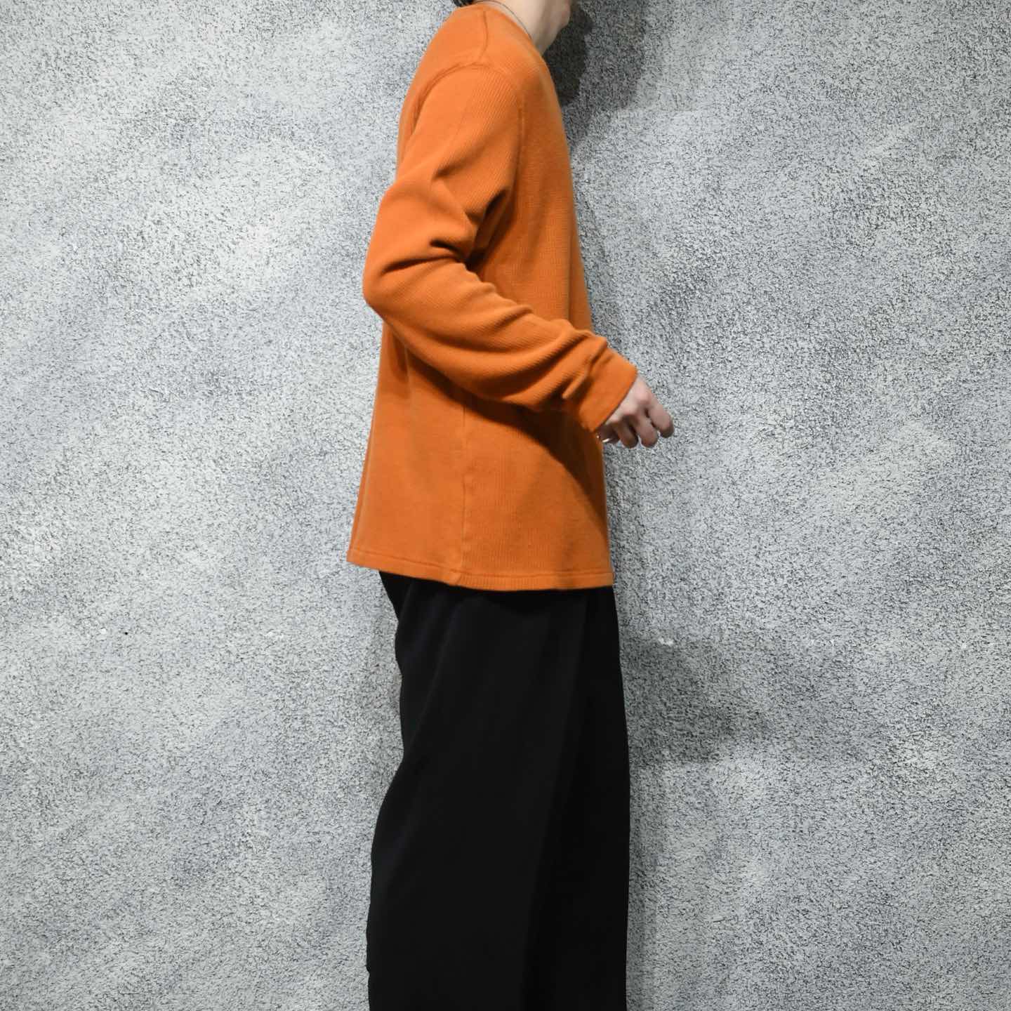 SIZE:L 着丈72cm 肩幅53cm 身幅60cm 袖丈70cm fabric/cotton 着用画像 177cm/64kg 一枚で元に置くと、各色集めたくなるサーマル。 そしてそう感じる人の一人でもあります。 やはりコーデ全体の”纏まり”を重視するのであれば、 インナーも古着の方が纏まりが出ますし、 気分も上がるなと。 そしてこの個体は、袖リブの先がかがり縫い仕立て。 インナーらしいディテールを兼ね備え、 インナーとしてはもちろん、チープ感の無い厚みから 1枚で着るのも違和感無く。 重ね着の季節、寒暖差のある季節に 頼りになるサーマル、それをこのカラーで。 ※撮影状況により、実物と多少色が異なる場合が ございます。 ※古着を取り扱っているため、気づかない汚れや ほつれ等がある場合がございます。 予めご了承ください。 ※サイズは着用感で選んでおり、 表記サイズではございません。 表記サイズは説明欄の最初に記載しております。 古着 オーバーサイズ old vintage ヴィンテージ used 80's 90's アメリカ古着 ユーロ古着 POLO RALPH LAUREN Eddie Bauer OLD GAP LANDS' END ランズエンド LLBean エルエルビーン オールドギャップ エディーバウアー ラルフローレン ブルックスブラザーズ Brooks Brothers オレンジ 長袖Tシャツ などがお好きな方 #vintage #オーバーサイズ #old #used #90s #80s #古着 #ヴィンテージ #アメリカ古着 #ユーロ古着 #LLBean #エルエルビーン #EddieBauer #エディーバウアー #oldgap #オールドギャップ #LANDSEND #ランズエンド #NAUTICA #ノーティカ #ラルフローレン #POLORALPHLAUREN #ブルックスブラザーズ #BrooksBrothers #サーマル #ロンT #カットソー #長袖Tシャツ #ワッフル #AmericanEagle