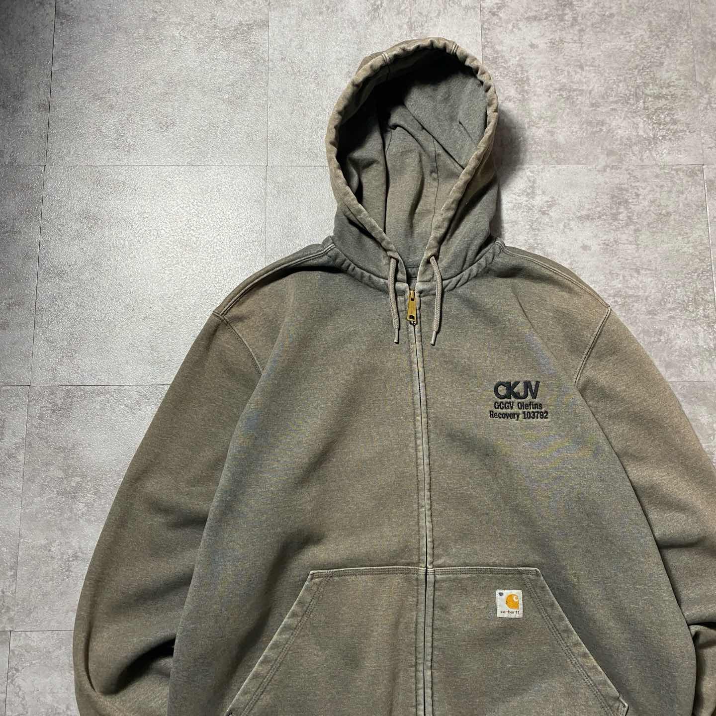 【XL】carhartt 最高フェード 刺繍企業ロゴ グレー ジップパーカー